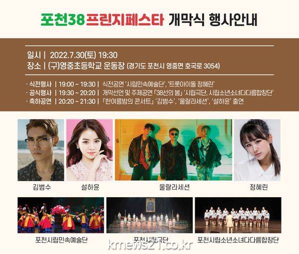 마지막 순서로는 포천38 프린지페스타 개막기념 ‘한여름 밤의 콘서트’로 가수 설하윤, 울랄라세션, 김범수의 축하공연을 진행한다.