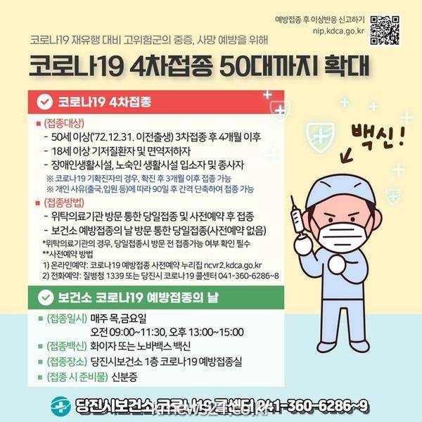 ▲ 사진=당진시당진시가 최근 전파력이 높은 신종변이의 확산으로 코로나19 감염병의 재유행에 대비, 50대 이상으로 대상자를 확대해 코로나 4차접종을 실시한다.