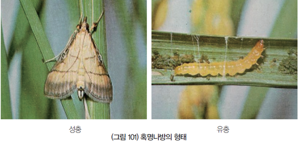 혹명나방은 해안선 인근에 많이 발생하며, 유충이 벼 잎을 좌우로 길게 원통형으로 말고, 그 속에서 잎을 갉아 먹는다. 피해를 받은 잎은 표피만 남고 백색으로 변하며, 발생이 많으면 논 전체에 피해가 발생하며, 출수가 불량해지고 등숙도 늦어진다.