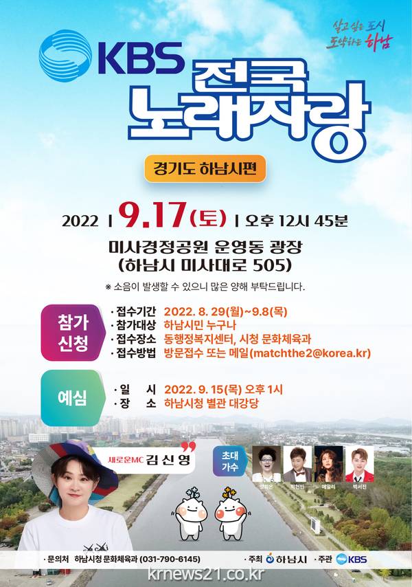 하남시는 미사경정공원 운영동 광장에서 진행되는 ‘KBS 전국노래자랑-하남시’편의 녹화시간이 17일 오후 2시에서 낮 12시45분으로 변경됐다고 밝혔다.