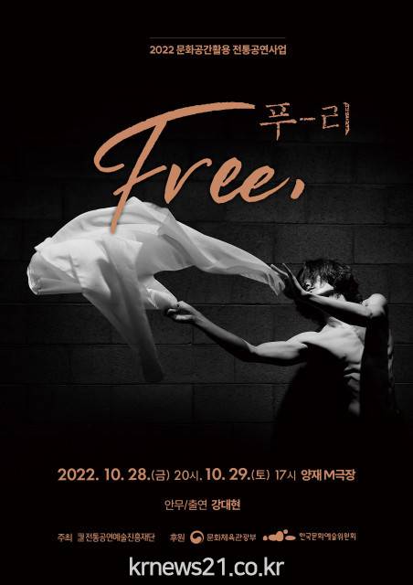 ‘Free, 푸-리’는 살풀이 춤을 모티브로, 의상과 분장의 화려함을 덜어내고 춤선에 단아한 아름다움을 더해 한국춤의 멋을 드러낸다. ‘나’에 대한 생각으로부터 출발해 자신을 억압하는 여러 가지 요인들, 홀로 나아가는 길, 미로와 같은 방황, 그 길목에서 만나게 되는 수많은 사람들과 상황을 지나 ‘자유’에 도달하는 6개의 장면으로 구성됐다. 움직임의 기교가 돋보이면서도 대중화돼 있는 살풀이가 새롭게 재해석돼 펼쳐질 예정이다.