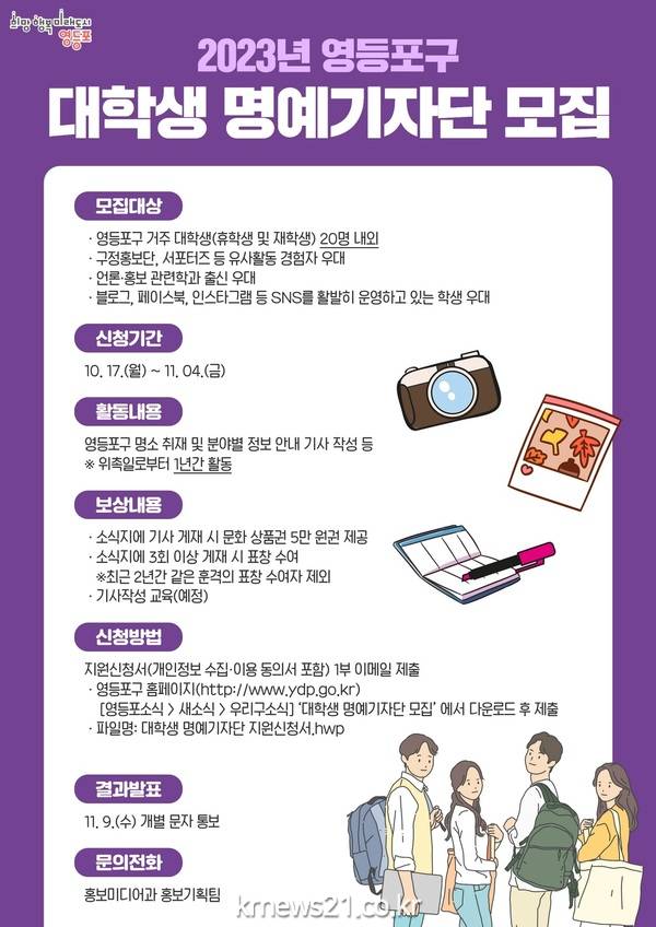 구 관계자는 “기자 또는 홍보 관련 분야 진로에 관심이 있다면 콘텐츠 기획부터 취재, 기사 작성까지 기자 활동을 직접 체험해 볼 수 있는 좋은 경험이 될 것”이라며 “영등포의 생생한 이야기와 숨은 매력을 널리 알려줄 재능 있는 대학생들의 많은 관심과 참여를 바란다”라고 전했다.