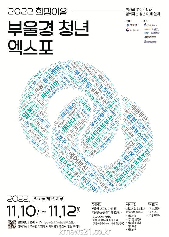 부산시(시장 박형준)는 부‧울‧경 우수기업 및 해외기업과 구직자 간 취업 연계를 적극적으로 지원하기 위해 11월 10일부터 12일까지 사흘간 벡스코 제1전시장 1홀에서 「희망이음-부‧울‧경 청년 엑스포」를 개최한다고 밝혔다.