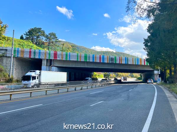 ▲ 사진=양산시청양산시는 사송신도시 조성과 함께 통행량이 늘어난 노포사송로를 가로지르는 경부고속도로 하부 터널 입면부에 경관 조형물 설치를 완료했다.