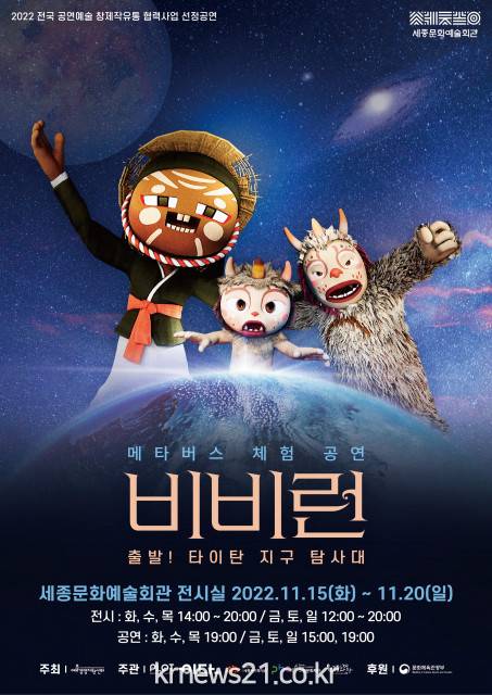 ▲ 사진=피엘오티피엘오티는 11월 15일(화)부터 20일(일)까지 세종시 세종문화예술회관에서 전통이 기술과 만나 그려낸 색다른 메타버스 체험 무료 공연 ‘비비런: 출발! 타이탄 지구 탐사대(이하 비비런)’을 진행한다고 8일 밝혔다.