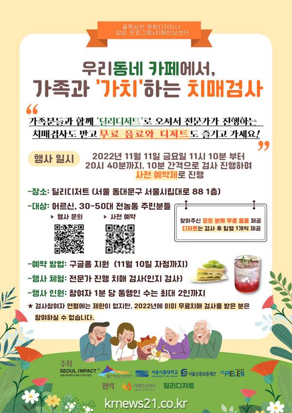 이번 행사는 오는 11일 오전 11시 10분부터 오후 8시 40분까지 진행된다. 사전 예약 후 올해 새롭게 치매안심마을로 지정된 전농1동에 위치한 ‘딜리디저트’ 카페를 가족과 함께 방문(동행인 최대 2인)하면 무료 음료쿠폰과 함께 치매 관련 상담과 검사가 가능하다.