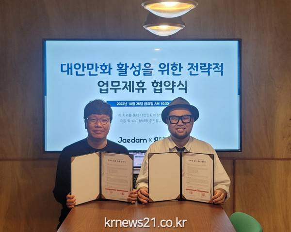 ▲ 사진=재담미디어웹툰 프로덕션 재담미디어(대표 황남용)와 언더그라운드 만화 회사 사이드B(대표 성인수)가 ‘대안만화 활성을 위한 업무 협약’을 체결했다.