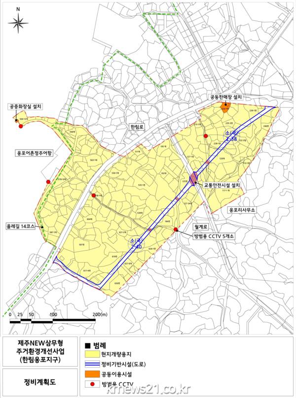 ‘한림옹포지구 주건환경개선사업’은 한림읍 옹포리 주거지역을 대상으로 총사업비 30억4천9백만원(도시주거환경정비기금)을 투입하여 2023년까지 ▲도시계획도로 2개 노선(B=8m, L=690m) ▲ 공동이용시설(공동판매장, 공중화장실) ▲ CCTV 5개소 설치 사업으로, 올해 내 공동이용시설 정비사업을 우선 시행하고, 2023년에는 도시계획도로 개설사업을 추진하여 2023년 말까지 사업을 마무리할 계획이다.