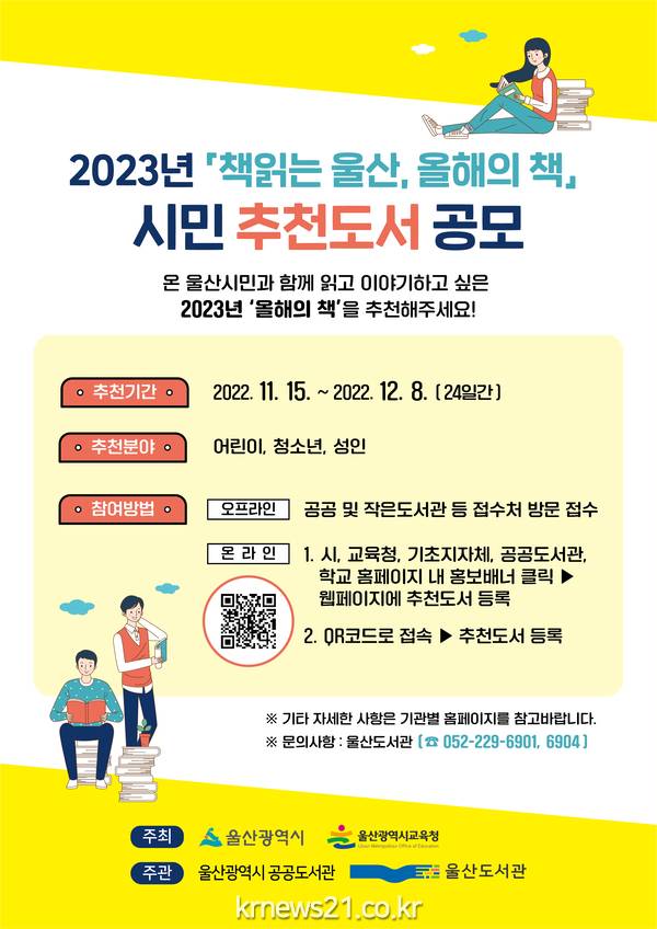 이번 시민 추천 도서 공모는 울산시민이면 누구나 가능하며 11월 15일부터 12월 8일까지 공공도서관에 방문해 추천서를 직접 작성하거나 도서관 누리집(library.ulsan.go.kr)을 통해 온라인 접수하면 된다.