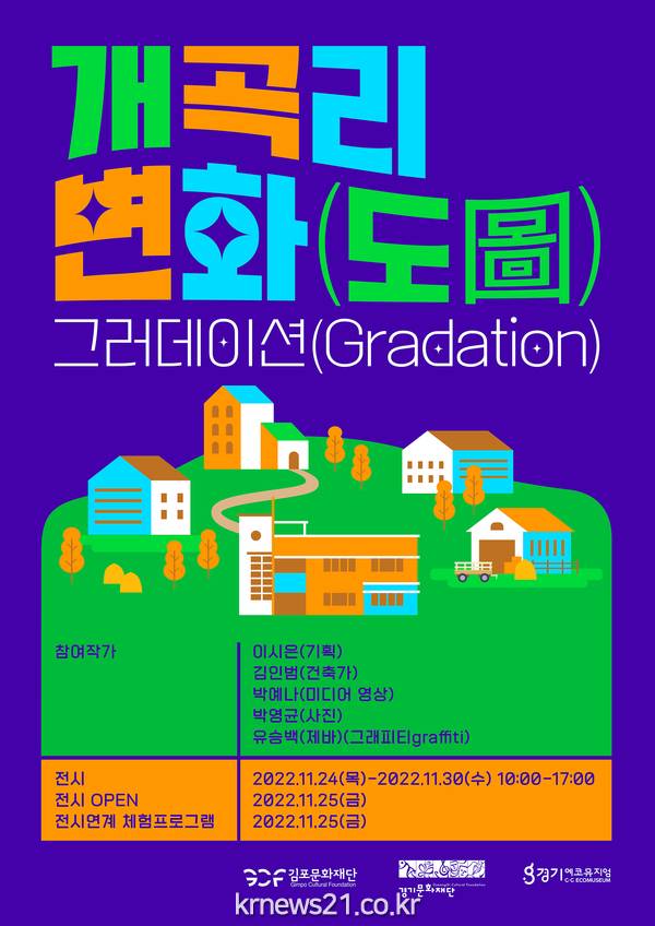 (재)김포문화재단은 (재)경기문화재단이 주최하는 2022 경기만 에코뮤지엄 조성 사업의 일환인 개곡복지회관 에코뮤지엄 개관 기념 전시 <개곡리 변화(도圖)>를 11월 24일부터 30일까지 선보인다고 밝혔다.