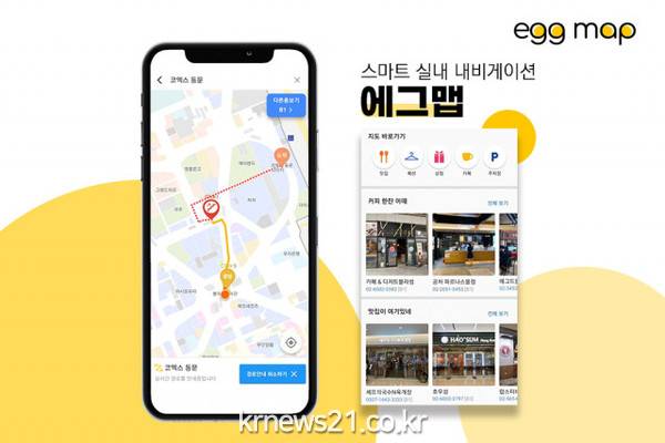 에그맵 앱은 대형 복합 시설에서 실내 길 찾기부터 매장 정보까지 쉽고 편리하게 이용할 수 있는 모바일 서비스이다. 최근 대형 복합 건물이 늘어남에 따라 건물 안에서의 길 안내 필요성이 증가하고 있었지만, 기존 GPS를 이용한 내비게이션 시스템은 건물 안에서의 활용이 불가능하므로 자기장 데이터를 기반으로 한 자체 개발 알고리즘을 통해 길 안내 서비스를 제공한다.