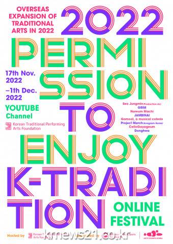 올해 제작된 영상을 공개하는 이번 온라인 축제명은 ‘Permission to Enjoy K-Tradition’으로, 팬데믹으로 많은 것들이 제한됐던 2021년에 세계인에게 즐거움과 자유의 메시지를 전한 BTS의 ‘Permission to Dance’에서 기인했다. 어떠한 제약과 한계 없이 K-전통예술의 흥과 아름다움을 즐겨보자는 의미를 담은 이번 페스티벌에서는 예술성과 대중성을 모두 느낄 수 있는 전통 창작공연 영상 8편을 선보이며 해외 각국의 문화예술 애호가를 대상으로 온라인 홍보가 진행된다.