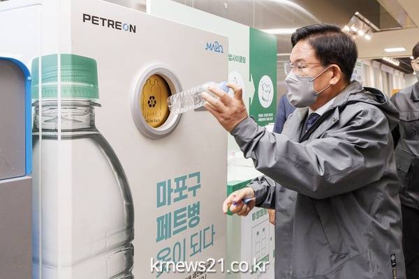 ▲ 사진=마포구청사 내 투명페트병 업사이클링 체험 공간에서 투명페트병 재활용 과정을 시연하는 박강수 마포구청장마포구(구청장 박강수)가 환경오염의 주범인 플라스틱을 감량하고 투명페트병의 재활용 체계를 고도화하기 위해 팔을 걷고 나섰다.