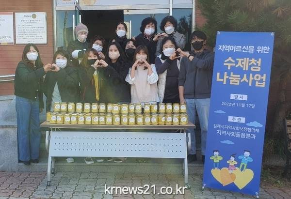 ▲  사진=김제시김제시 지역사회보장 협의체(공동위원장 최병철) 지역사회돌봄분과에서는 지난 17일, 겨울철을 맞아 홀로 지내는 어르신과 학대피해노인을 위해“겨울철 대비 지역 어르신을 위한 수제청 나눔”이라는 주제로 사업이 진행되었다.