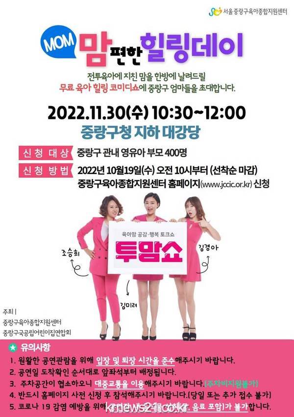▲ 중랑구, 육아 공감·행복 토크쇼 MOM편한 힐링데이 ‘투맘쇼’ 개최 중랑구(구청장 류경기)는 30일 오전 10시 30분 구청 지하대강당에서 중랑구육아종합지원센터와 중랑구국공립어린이집연합회 주최로 육아에 지친 부모들을 위한 토크쇼 ‘MOM편한 힐링데이 투맘쇼’가 개최된다고 밝혔다.