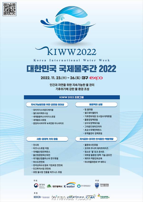 대구시는 올해 5회를 맞는 대한민국 국제물주간에 물 분야 해외 도시 대표, 학계 및 기관 전문가들이 참여하는 세계물도시포럼, 국제물산업컨퍼런스, 세계물클러스터 리더스포럼을 11월 23일(수)부터 11월26일(토)까지 엑스코에서 개최한다. 기후변화에 따른 물 위기 극복 등 도시 물이슈 공유 및 해결방안을 논의하는 장을 마련한다.