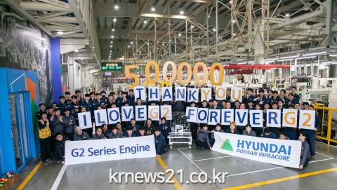 현대두산인프라코어는 G2엔진(1.8~3.4L급 소형 엔진) 생산 및 출하 50만대 달성을 기념해 22일(화) 인천 공장 G2엔진 출하장에서 기념식을 가졌다. 2012년 10월 G2엔진 공장을 준공하고 본격 양산에 들어간 지 10년만이다.