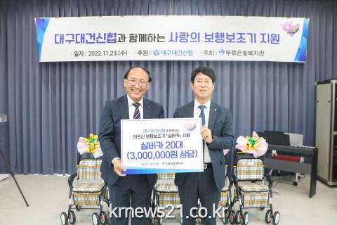 대구대건신협은 지역 내 거동이 불편한 저소득 어르신들의 힘겨운 발걸음에 든든한 발이 되기 위해 300만원 상당의 실버카(보행보조기)를 두류은빛복지관에 전달했다.