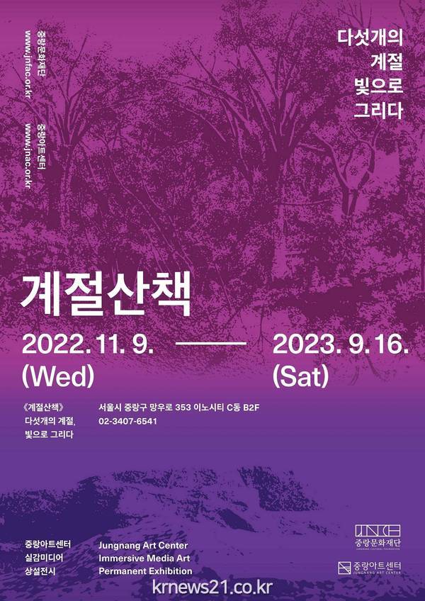 중랑구(구청장 류경기)는 중랑아트센터가 서울 동북권 최초로 100평 규모의 실감미디어 전시실을 개관하고 내년 9월 16일까지 상설 전시 ‘계절산책 - 다섯 개의 계절, 빛으로 그리다’를 개최한다고 밝혔다.