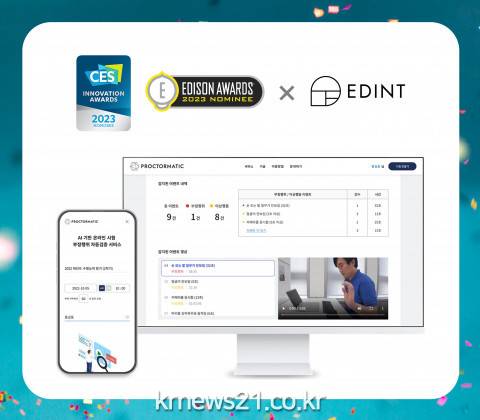 ▲ 사진=에딘트온라인 시험 인공지능(AI) 자동 관리 감독 서비스 ‘프록토매틱’의 운영사 에딘트(대표 원동일)는 ‘CES 2023 혁신상’ 수상 및 ‘2023 에디슨 어워드’ 교육 서비스 부문 후보에 지명됐다고 밝혔다.