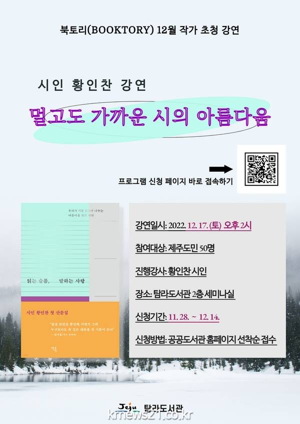 탐라도서관 독서문화프로그램 담당은 “이번 북토크를 통해 평소 어려웠던 문학 장르인 시의 아름다움을 발견할 수 있는 좋은 기회가 될 것이라 기대한다”며 제주시민의 많은 참여를 당부했다.