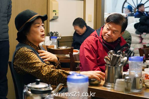 이필형 동대문구청장이 청량리 전통시장 내 위치한 음식점 다미옥에서 둥지고시원 거주자들을 만나 식사를 함께 하며 안부를 물었다.