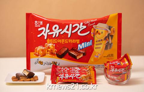 ▲ 사진=해태제과식품해태제과(대표이사 신정훈) 자유시간이 오리지널의 달콤함에 짭짤한 맛을 더한 단짠 초코바 ‘솔티드 아몬드 카라멜’을 출시한다.