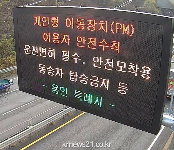 ▲ 사진=시가 수지구의 한 도로전광판에 개인형 이동장치 안전수칙을 송출하고 있는 모습용인특례시(시장 이상일)가 안전한 개인형 이동장치(Personal Mobility, PM) 이용 문화를 만들기 위해 시민들에게 당부하고 나섰다.