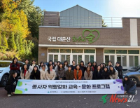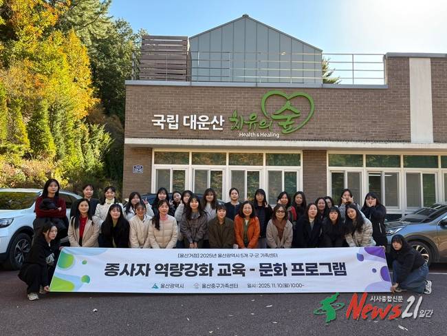(뉴스21일간/노유림기자)=울산중구가족센터(센터장 서선자)가 11월 10일 오전 10시 국립 대운산 치유의 숲에서 울산 지역 5개 구·군 가족센터 종사자 30명을 대상으로 ‘거점사업 종사자 역량 강화 교육’을 실시했다. 이번 교육은 가족센터 종사자의 스트레스 관리를 돕고 업무 역량을 강화하기 위해 마련됐다. 이날 참여자들은 산림교...