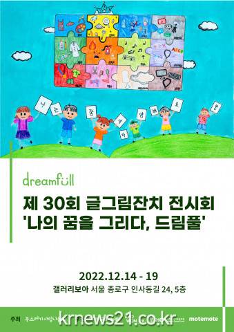 ▲ 사진=부스러기사랑나눔회드림풀 부스러기사랑나눔회(대표 윤종선)가 14일부터 19일까지 갤러리보아(인사동)에서 제30회 글그림잔치 ‘나의 꿈을 그리다, 드림풀’ 전시회를 개최한다. 글그림잔치는 하나금융나눔재단과 교원그룹, 인하우스카운슬포럼 그리고 모트모트가 후원한다.