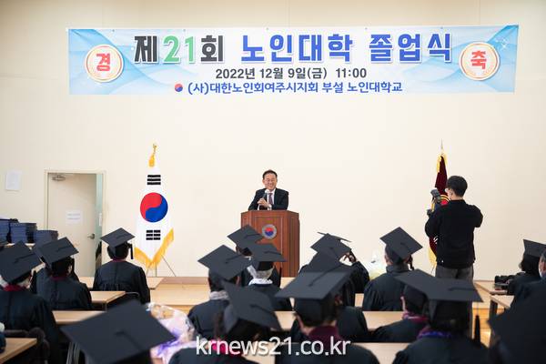 지난 9일 여주시(시장 이충우)는 사)대한노인회 여주시지회(지회장 김병옥) 주관으로 여주노인대학(대학장 박정수) 52명 학생들의 ‘제21회 여주노인대학 졸업식’을 개최했다.