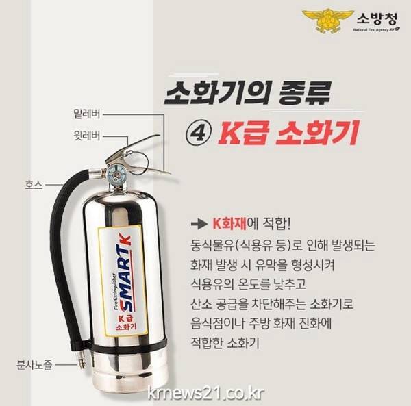 주방화재는 흔히 보이는 분말 소화기를 사용하면 재발화 위험성이 크기 때문에 식용유 화재에 적응성이 있는 K급 소화기가 필요하다.