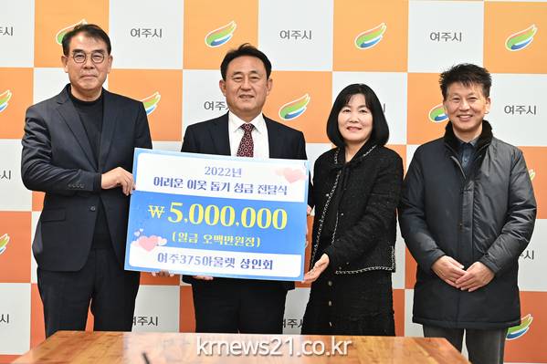 여주375아울렛 상인회(회장 이재권)는 12일 여주시청을 방문해 관내 소외계층을 위해 써달라며 성금 500만원을 기탁했다.