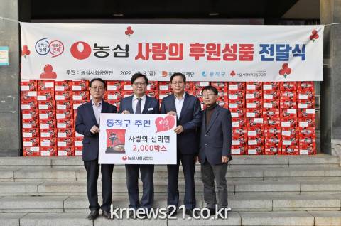 농심 홍보 담당자는 “매년 겨울철이 되면 주변 이웃들을 위한 사랑 나눔에 나서고 있다”며 “농심 임직원들의 마음을 담은 라면이 추위를 이겨내는 데 조금이나마 힘이 됐으면 좋겠다”고 밝혔다.