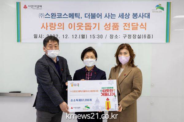 김영선 ㈜스완코스메틱 대표는 “어려운 이웃에게 따뜻한 마음을 전달할 수 있어 큰 행복감을 느낀다. 앞으로도 많은 관심을 가지고 이웃들을 향한 나눔 실천을 위해 더욱 힘쓰겠다”고 전했다.