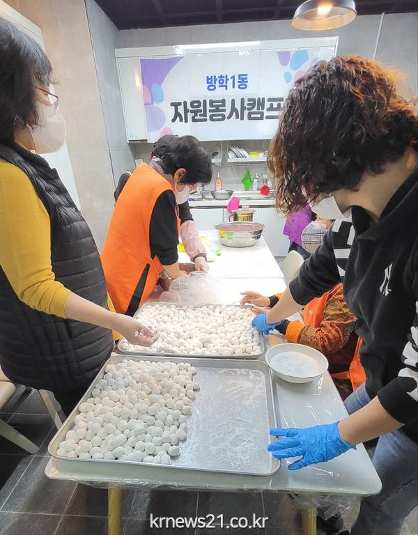 ▲ 사진= 도봉구 자원봉사캠프 활동가들이 팥죽 새알 만드는 모습도봉구(구청장 오언석) 방학1동 자원봉사캠프(캠프장 이준호)는 다가올 동지를 맞아 직접 팥죽을 쑤어 지역 어르신 및 저소득층 50여 가구에 전달했다.
