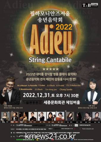 티앤비엔터테인먼트가 12월 31일 저녁 7시 30분 세종문화회관 체임버홀에서 명품 클래식 컬래버 콘서트 필하모니안즈서울 송년음악회-Adieu 2022를 개최한다.