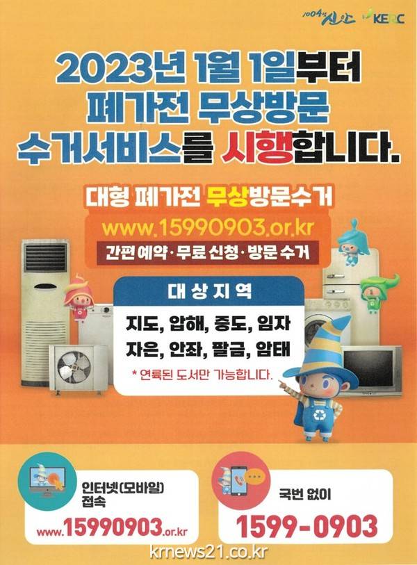 신안군(군수 박우량)이 2023년 1월 1일부터 주민공감 청소행정 실현과 자원의 순환이용 활성화를 위해 폐가전 무상방문 수거서비스를 도입하여 시행한다.