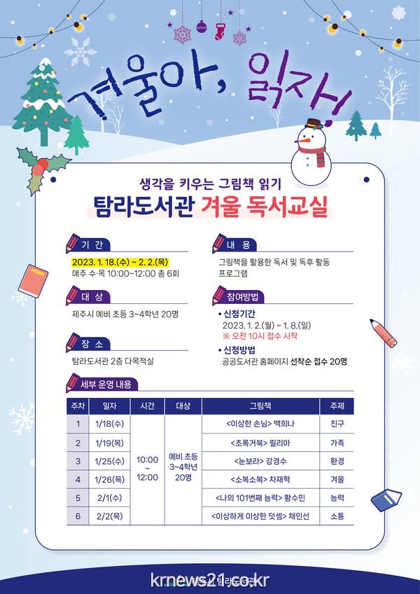 ▲ 사진=제주시제주시 탐라도서관은 겨울방학을 맞이해 어린이들에게 독서의 즐거움을 일깨우기 위한‘2023년 겨울독서교실’을 운영한다.