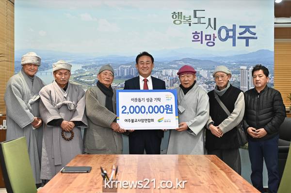 ▲ 여주불교사암연합회, 연말 이웃돕기 성금 200만원 기탁 여주불교사암연합회(회장 지행법진 스님)는 26일 여주시청을 방문해 지역 내 어려운 이웃을 위해 사용해달라며 성금 200만원을 기탁했다.