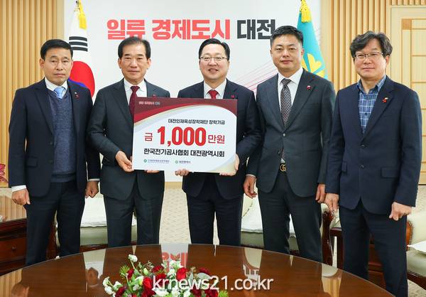 대전시는 27일 한국전기공사협회 대전광역시회 김양은 회장이 대전시청을 찾아 대전인재육성장학재단 이장우 이사장에게 대전사랑 장학기금 1,000만 원을 전달했다고 밝혔다.