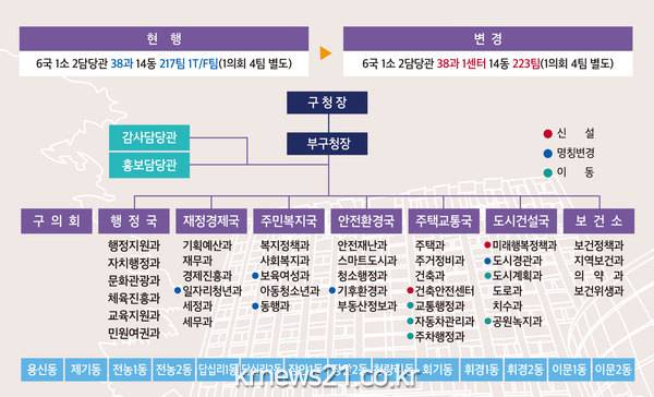 이필형 동대문구청장은 “구민이 체감할 수 있는 새로운 동대문구를 실현하기 위해 심도 깊은 연구와 고민을 거쳐 조직을 대대적으로 개편하게 됐다”며, “직원들과 함께 개편된 조직을 원활하게 운영해 구정 발전을 이끌어 나가겠다”고 밝혔다.