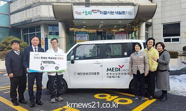 군은 지난 28일 태안군보건의료원에서 의료원 관계자와 한국건강관리협회 관계자 등 10여 명이 참석한 가운데 ‘2022 장애인특화차량 전달식’을 갖고 2473만 원 상당의 소형 개조차량 1대를 기탁받았다고 밝혔다.