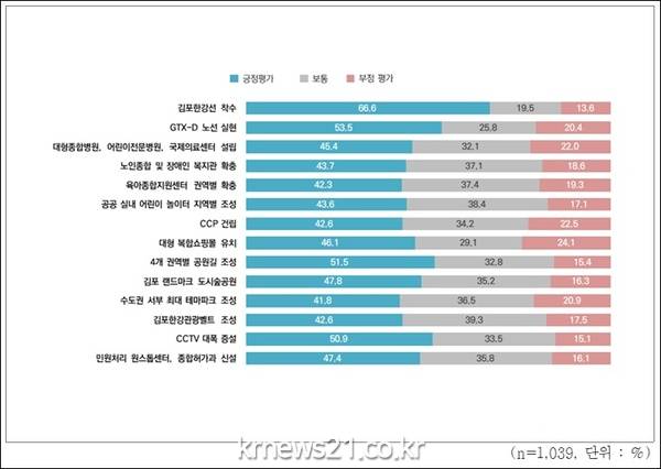 김포시는 27일 ‘2022 김포시정 일반 만족도 조사’를 발표했다. 만족도 산출 모형으로는 각 조사항목별 ‘5점 척도(각 점수 100점 만점 환산 계산)’가 사용됐다. 그 결과, 김포시 역점사업 평가 중 ‘김포한강선 착수(서울 지하철 5호선 연장)’ 사업에 대해 “잘하고 있다”는 응답은 66.6%(3.70점)으로 가장 높은 만족도로 집계됐다. 이어 GTX-D 노선 실현 53.5%(3.43점), 대형종합병원·어린이전문병원·국제의료센터 설립 45.4%(3.29점), 노인종합 및 장애인 복지관 확충 43.7%*3.29점) 순으로 조사됐다.