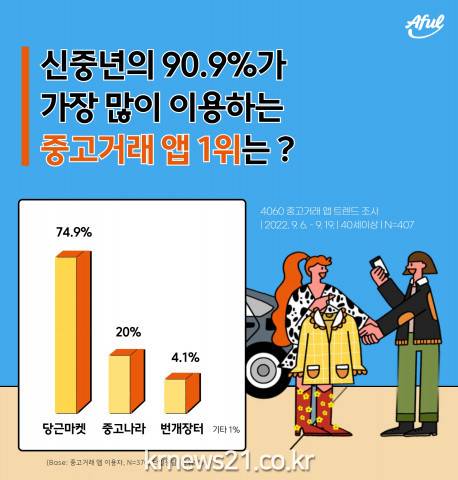 이번 조사에 참여한 신중년 열에 아홉인 90.9%가 중고 거래 앱을 이용한 경험이 있는 것으로 조사됐다. 이처럼 4060도 중고 거래에 높은 경험도를 보이는 가운데 신중년이 애용하는 중고 거래 앱 1위는 ‘당근마켓’이 차지했다. 당근마켓을 선택한 이들은 전체 응답의 74.9%를 차지했다. 2위는 ‘중고나라(20%)’, 3위는 ‘번개장터(4.1%)’로 나타났다.