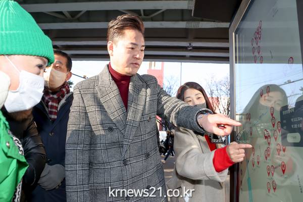 ▲ 사진=오언석 도봉구청장이 도봉구 창동역 전자게시대를 시연하고 있다도봉구(구청장 오언석)는 2022년 12월 29일 창동역 1번 출구 앞 광장에서 전자게시대 제막식과 기부금 전달식을 진행했다.