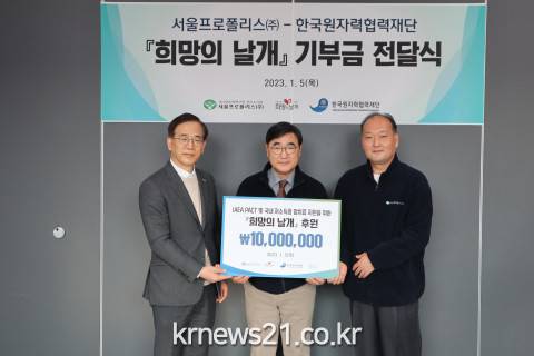 신준호 한국원자력협력재단 사무총장은 “원자력 유관 기업의 기부활동 참여는 매우 뜻깊은 일이며, 특히 이번 후원금 재원 마련을 위해 서울프로폴리스 임직원 전원이 참여한 만큼 소중한 기부금이 뜻깊은 곳에 쓰일 수 있도록 국내·외 암 치료 지원을 위한 다양한 활동을 전개하겠다”고 말했다.