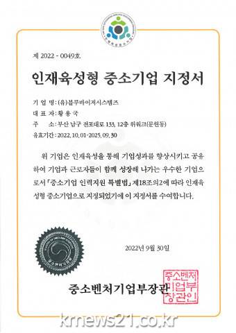 ▲ 사진=블루바이저시스템즈인공지능(AI) 솔루션 개발 전문기업 블루바이저시스템즈(대표 황용국)는 중소벤처기업부가 주관하는 2022년 인재육성형 중소기업으로 선정됐다고 밝혔다.