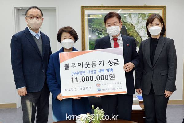 해성학원은 서울시교육청이 초·중등학교 운영 학교법인을 대상으로 시행한 2022년 사학기관 운영평가에서 ‘종합평가 우수기관’(종합 우수상)으로 선정됐으며, 이에 따른 시상금 1,100만 원을 지역의 어려운 이웃을 위해 써달라며 상금 전액을 기탁했다.