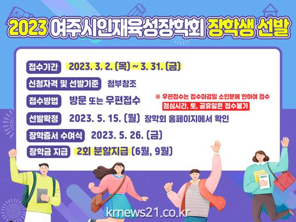 재단법인 여주시인재육성장학회(이사장 유영설)는 유능한 인재를 양성하고 지역사회 발전에 이바지하고자 ‘2023년 여주시인재육성장학회 장학생 선발계획’ 공고를 1월 10일(화)에 여주시인재육성장학회 홈페이지(www.yeojulove.or.kr) 및 여주시청 홈페이지(www.yeoju.go.kr)에 게시한다.